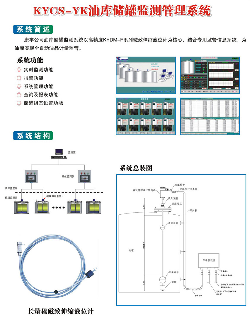康宇公司油庫(kù)儲(chǔ)罐監(jiān)測(cè)系統(tǒng)以高精度KYDM-F系列磁致伸縮液位計(jì)為核心,結(jié)合專(zhuān)用監(jiān)管信息系統(tǒng),為油庫(kù)實(shí)現(xiàn)全自動(dòng)油品計(jì)量監(jiān)管。系統(tǒng)能在油庫(kù)油罐密閉的情況下,通過(guò)各個(gè)液位計(jì)完成對(duì)各自?xún)?chǔ)油罐中油品的自動(dòng)測(cè)量,完成現(xiàn)場(chǎng)控制器實(shí)現(xiàn)對(duì)整個(gè)庫(kù)區(qū)液位傳感器所測(cè)數(shù)據(jù)的運(yùn)算、顯示和遠(yuǎn)程傳輸;遠(yuǎn)程計(jì)算機(jī)結(jié)合所接收的數(shù)據(jù),并通過(guò)其內(nèi)部的專(zhuān)用管理軟件,實(shí)現(xiàn)油罐中油品參數(shù)的分析,直接反映出儲(chǔ)罐的運(yùn)行情況。管理者可通過(guò)自己的計(jì)算機(jī)及時(shí)地掌握和了解每個(gè)儲(chǔ)罐的運(yùn)行情況,從而合理地進(jìn)行生產(chǎn)安排和調(diào)度。