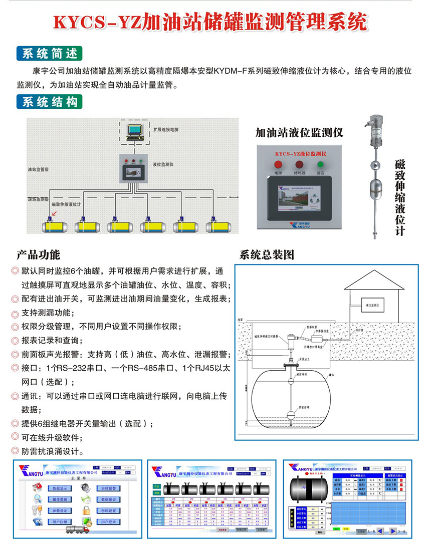 康宇公司加油站儲罐監測系統以高精度KYDM-F系列磁致伸縮液位計為核心,結合專用的液位監測儀,為加油站實現全自動油品計量監管,主要實現了對監測儀器數據的讀取顯示,危險報警,漏液檢測,報表查詢等一系列功能。