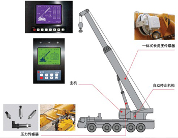 力矩限制器的力矩檢測是對汽車起重機變幅油缸大、小腔引出壓力油通過壓力傳感器,可以檢測出變幅油缸的壓力值,并轉換成為電信號,送至中心機構運算后顯示出來。